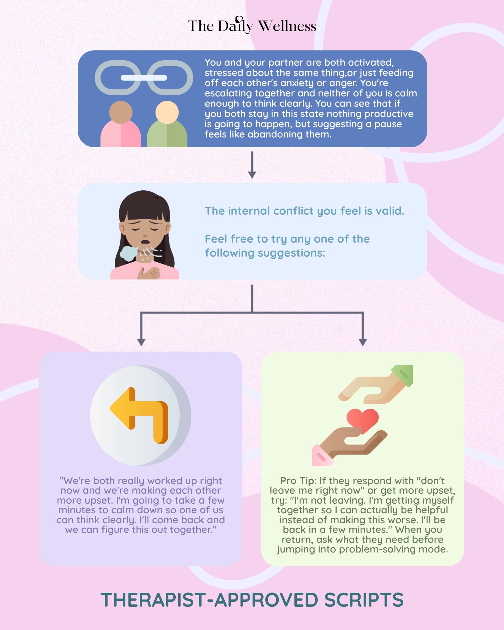 The Scenario: You and your partner’s emotions are running high, stressed about the same thing, reacting to something that happened, or just feeding off each other's anxiety or anger. In the moment, neither of you is calm enough to think clearly. You can see that if you both stay in this state, nothing productive is going to happen, but suggesting a pause feels like abandoning them when they're already upset.
