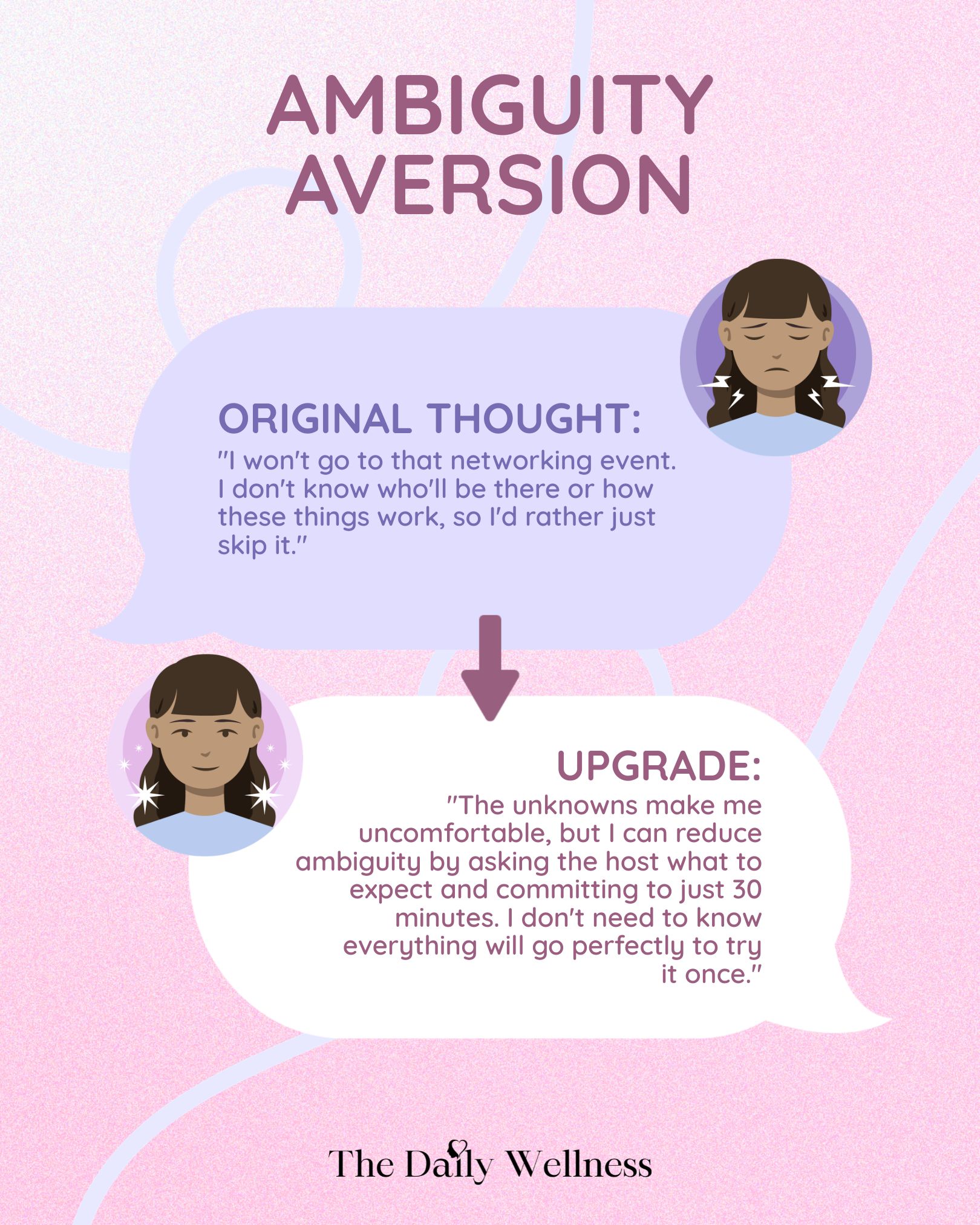 Upgrade: "The unknowns make me uncomfortable, but I can ask the host what to expect and just commit to thirty minutes. I don't need to know everything will go well to try it once.”