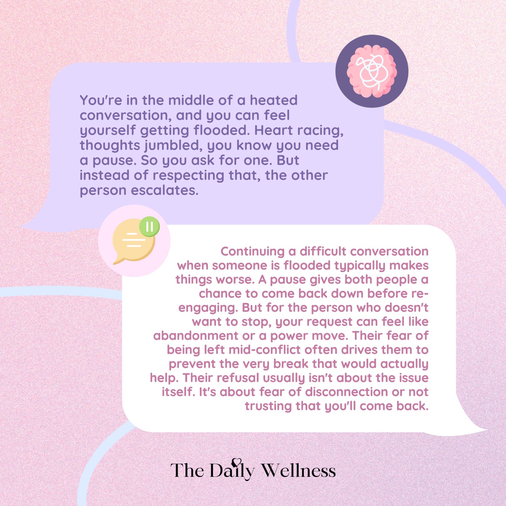 The Scenario: You're in the middle of a heated conversation, and you can feel yourself getting flooded. Heart racing, thoughts jumbled, you know you need a pause before you can continue without making things worse. So you ask for one. But instead of respecting that, the other person escalates.