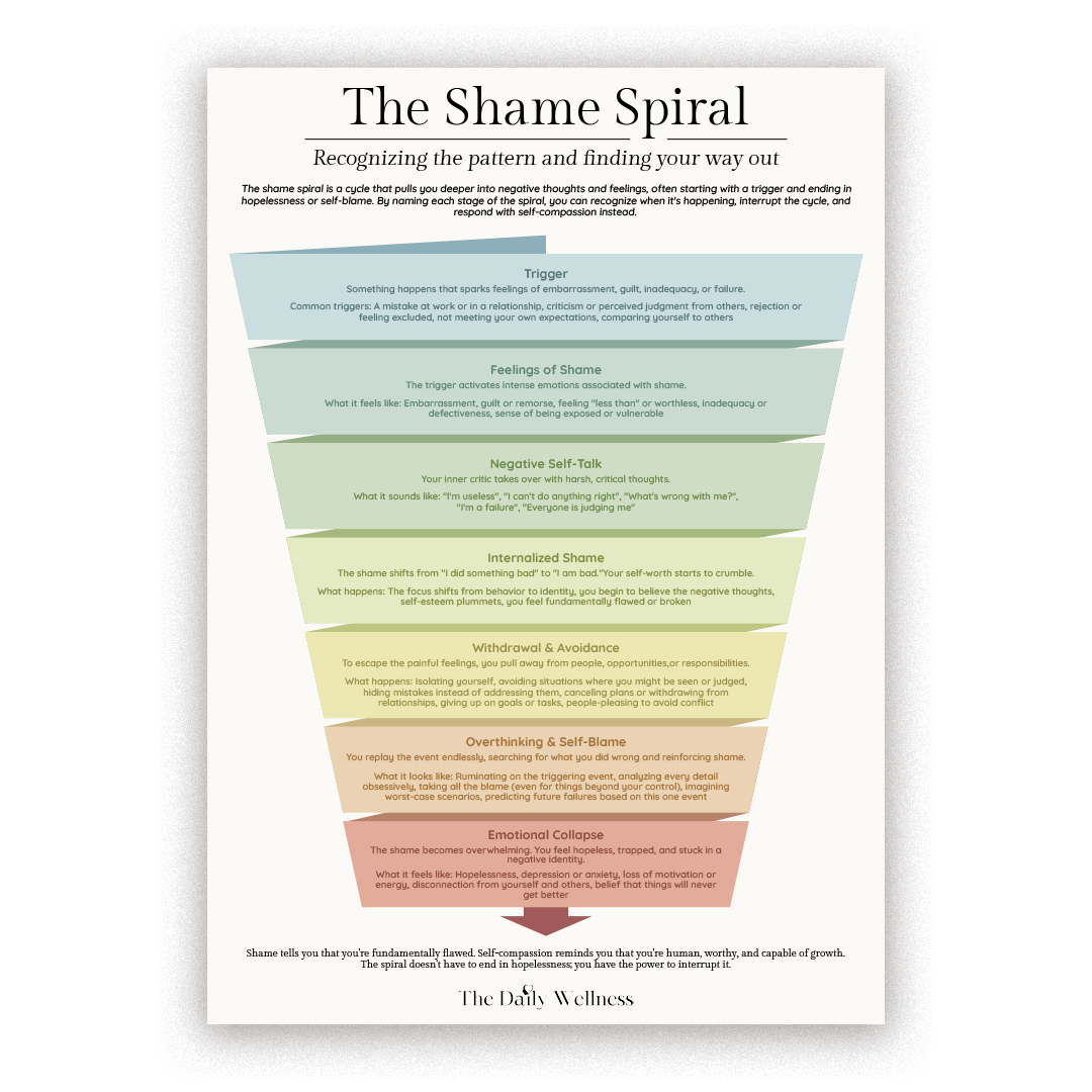 The shame spiral pulls you deeper into negative thoughts and feelings, starting with a trigger and ending in hopelessness or self-blame. By naming each stage, you can recognize when it's happening and interrupt the cycle with self-compassion instead. Download your free Shame Spiral guide and learn to recognize the pattern.